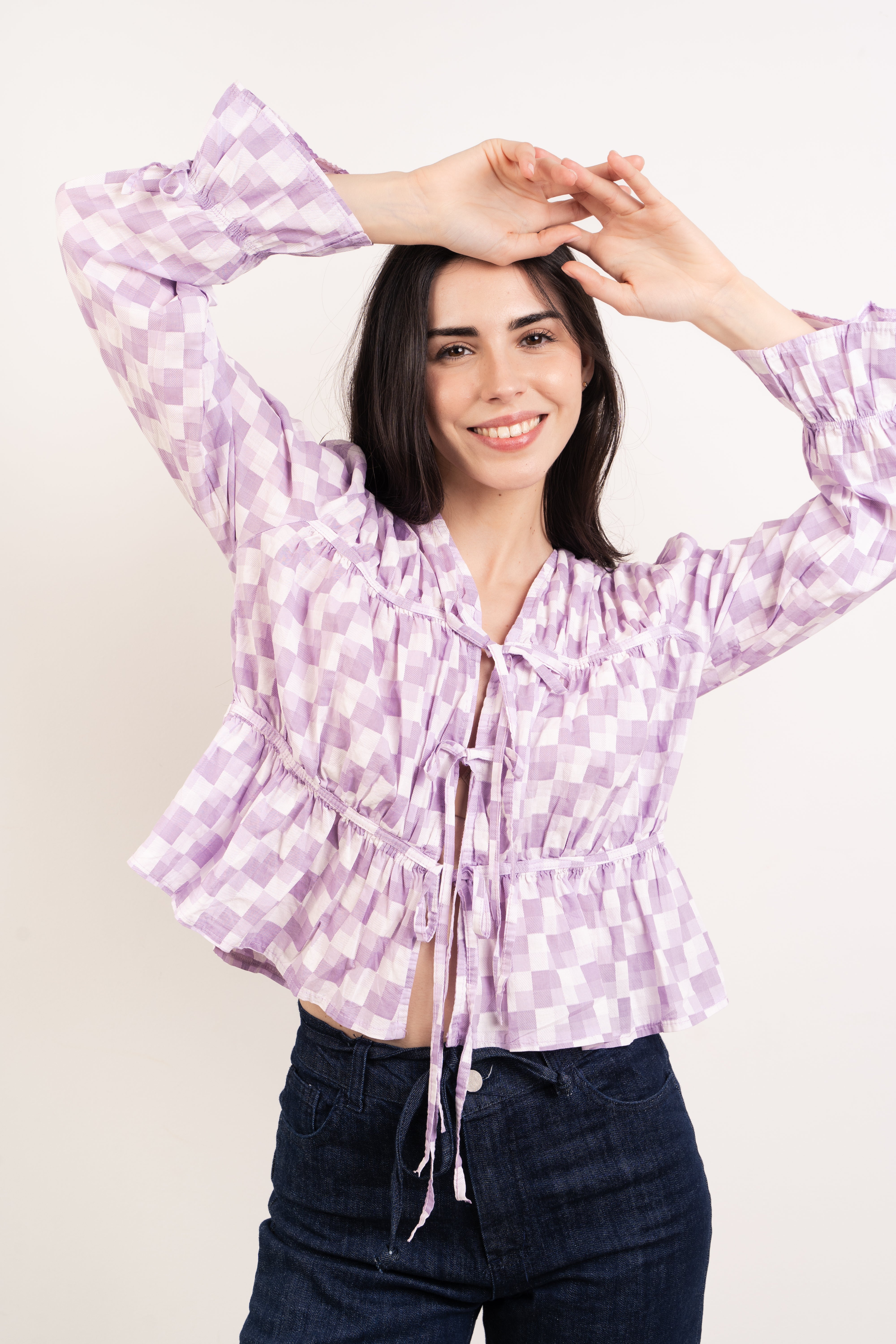 Lavender-hued checkered blouse with a front tie closure. Bow detail at the cuff.