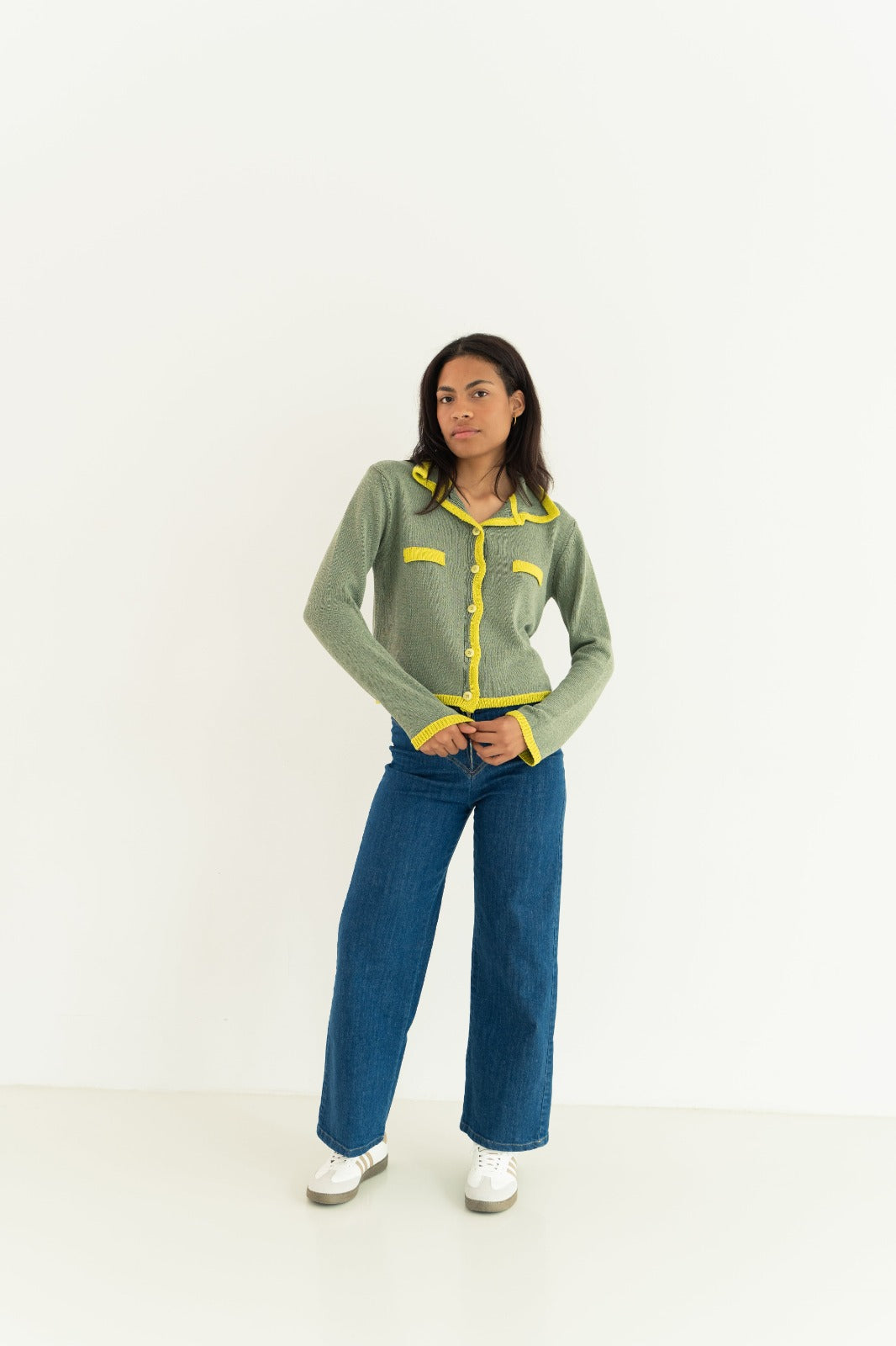 Cárdigan de punto en color verde con botones delanteros a tono y cuello pico. Tiene dos falsos bolsillos delanteros. Borde del cuello, bolsillos y mangas en tono pistacho.