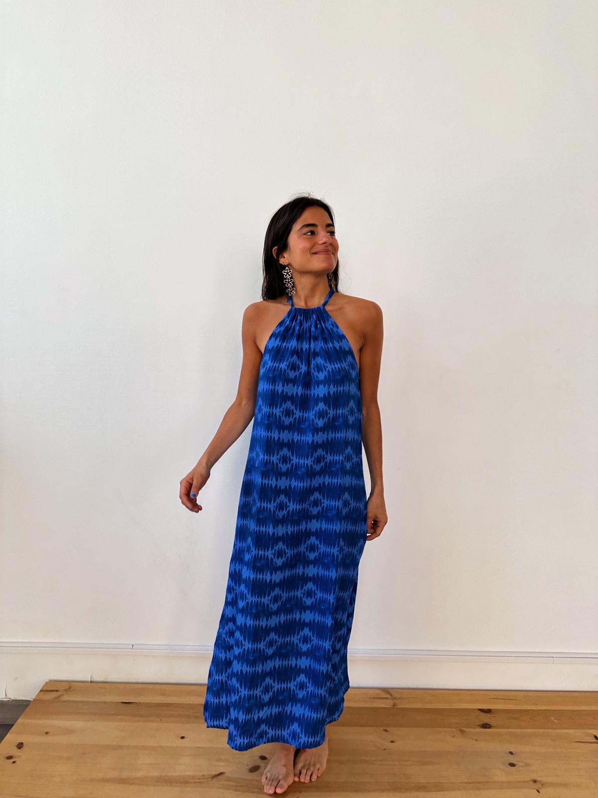 Vestido largo de color azul con escote halter y estampado geométrico. Cierre trasero con lazada.